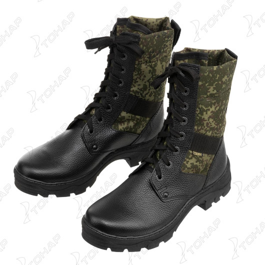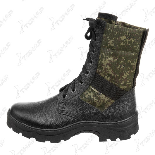 Ботинки «Охрана» облегчённые Назначение: для охранных и силовых структур. Обувь предназначена для эксплуатации в условиях, приближенных к экстремальным. Натуральная кожа - 'Тулип' с повышенным содержанием жиров и водоотталкивающей ткани, с микропористым полиуретановым покрытием. Обладает мембранным эффектом. Легко поддается аэрозольной обработке. Для повышения прочности обуви и защиты ног от случайных ударов в носовой и пяточной части вклеены усиливающие элементы. Летняя модификация внутренняя подкладка - «х/б». При изготовлении применяются высокопрочные нитки Guterman (Германия). Комфортная температура эксплуатации: от +5° до +25°С Наружный слой обуви: Натуральная кожа КРС / Спецткань Oxford с водоотталкивающей (WR) пропиткой Подошва: Термоэластопласт - износостойкая(ТЭП) Крепление подошвы: Клеепрошивной Высота обуви: 22 см. Отличительные особенности Усиливающие элементы в носовой и пяточной частях; Оптимальная высота ботинка обеспечивает фиксацию голеностопного сустава, создавая устойчивость при ходьбе, предупреждая вывихи; Металлический супинатор (геленок) для поддержания свода стопы; Без подкладки; Подошва повышенной износостойкости с высокими показателями грунтозацепляемости;