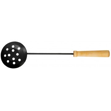 Ложка черпака имеет вид шумовки, изготовлена из стали, дополнительно окрашена полимерной порошковой краской. Ручка черпака изготовлена из березы, покрыта специальным защитно-декоративным составом и имеет удобную форму, предотвращающую выскальзывание черпака из рук. Прочность и надежность конструкции обеспечивает длительный срок службы черпака.