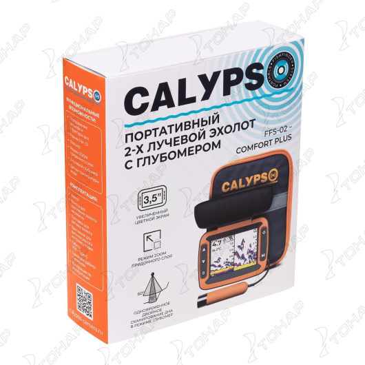 Портативный двухлучевой эхолот с глубомером Calypso FFS-02 – Comfort Plus Calypso Comfort Plus – портативный двухлучевой эхолот нового поколения, выполненный в виде моноблока с защитным козырьком. Преимущества модели FFS-02 – Comfort Plus: Цветной LCD дисплей 3,5” (8,9 см) – самый большой в классе портативных эхолотов для зимы. Интуитивно понятный интерфейс и удобное управление. Полноэкранный Zoom – для работы на больших глубинах и получения информации о придонном слое. Вертикальный флешер – для наблюдения за объектами в режиме реального времени. Глубомер – уникальный режим двойного сканирования, который позволит найти уловистые места быстрее. Расширенный набор дополнительных возможностей: регулировка детализации, цветности, чувствительности, фильтр помех, регулировка слепой зоны, режим Fish ID. Оригинальная сумка-планшет для хранения, транспортировки и комфортной работы с эхолотом. Возможность самостоятельного обновления ПО. Характеристики: Цвет: оранжевый; Диагональ монитора:3,5' (8,9 см); Вес: 0.43 кг; Количество лучей: 2; Частота излучателя: 120/290 кГц; Максимвльная глубина сканирования: 30 м; Длина кабеля: 2 м; Водонепроницаемость: IP68; Разрешение монитора: 320х240 px; Тип дисплея: LCD цветной; Время работы эхолота от одной зарядки: 8 ч; Диапазон температур эксплуатации: -30 °C - + 60 °C; Встроенная аккумуляторная батарея: LiPo 4000 mAh; Размер электронного блока: 107х95х38 мм. Комплектация: Клипса для крепления эхолота на ремень или стропу; Сумка для хранения и переноски эхолота; Поплавок для датчика; Противоударный буфер для датчика; Кронштейн для крепления датчика на транец лодки с помощью струбцины (струбцина в комплект не входит); Провод для зарядки USB Type-C; Инструкция по эксплуатации.