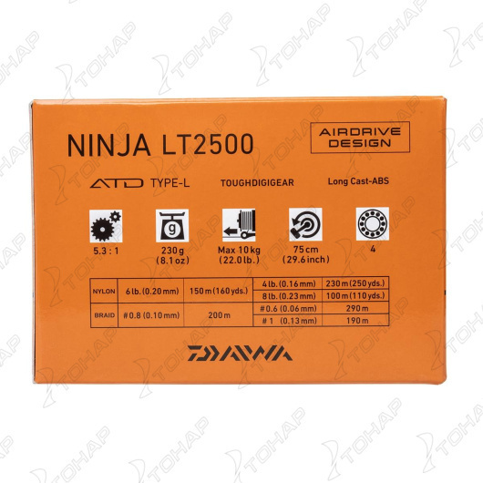 В 23-футовом Ninja DAIWA предлагает новейшую японскую концепцию дизайна и вдохновляющую технику – при превосходном соотношении цены и качества! По сравнению с предыдущей моделью 23-футовый Ninja был улучшен по основным функциям и теперь стал более чувствительным и прочным. Благодаря использованию нового легкого ротора Airdrive баланс катушки смещается с передней части на нижнюю часть, что приводит к улучшению общего баланса и повышению чувствительности при ловле. Чувство приманки улучшается, и возможна более быстрая реакция. Точный и прочный Digigear обеспечивает высокую мощность подъема, а также постоянную плавность и равномерность хода. Новая дужка Airdrive легче предыдущей версии, очень прочная и в сочетании с новой дужкой значительно уменьшает запутывание при забросе. Если леска запутается в дужке, она просто скользит к ролику лески через рычаг при повороте ручки – и действие необходимо. Фрикцион ATD Type-L обеспечивает равномерное и оптимизированное освобождение лески под нагрузкой без высокого стартового сопротивления, обеспечивая необходимую безопасность при борьбе с крупными экземплярами. Алюминиевая шпуля Longcast ABS оснащена специальным ободом, который способствует увеличению дальности заброса. Конструкция лесоукладчика Twistbuster III идеально подходит для использования плетеных лесок: плетенка не сжимается во время проводки, что приводит к меньшему скручиванию. Оборудование: размеры 1000, 2000 и 2500-XH поставляются с ручкой I-образной формы, размеры от 2500 до 6000 — с ручкой T-образной формы.