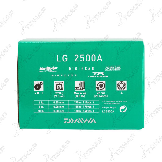 Выпустив серию безынерционных катушек LG (с литерой А), специалисты японской компании Daiwa в очередной раз доказали - хорошая и функциональная вещь не обязательно должна стоить много. Все пять моделей, входящих в эту линейку, имеют компактный корпус Hard Bodyz (с применением металлического сплава), а также оснащены облегченным узлом Air Rotor, который за счет своей геометрии, будучи даже полым, выдерживает значительные нагрузки, дополнительно снижая вибрации. В конструкции LG имеется 4 шарикоподшипника. Фирменная ABS шпуля с лесоемкостью 140м/0.20мм - 270м/0.30мм сконструирована таким образом, чтобы в ходе рыбалки минимизировать возможность образования петель. Этой же цели служит ролик Twist Buster, не дающий леске перекручиваться. Предусмотрен анти-реверс, но используя переключатель (в нижней части корпуса) вы сможете вращать ротор в обоих направлениях. Складная рукоять из алюминия оснащается двумя типа кнобов: прорезиненным плоским или пластиковым Т-образным. Еще отметим регулировочный набор, состоящий из пластиковых шайб, входящих в комплектацию. Осталось добавить, что вес катушек Daiwa LG A находится в пределах от 235 до 390 гр, а передаточное число от 4.7 до 4.9:1. Характеристики: Производитель: Daiwa Вид ловли: спиннинг Страна изготовления: Китай Вес, гр.: 265 Нагрузка на фрикцион, кг.: 4 Намотка за оборот ручки, см.: 72 Объем шпули: 0,25 мм/ 190м Передаточное число: 4,8:1 Количество подшипников: 4 Диаметр переднего бортика шпул, мм.: 48 Класс катушки: light Кнопка на рукояти: нет Комплектация: Запасной шпули в комплекте нет Способ крепления рукояти: прижимной винт Тип механизма: планетарный Фрикцион: передний