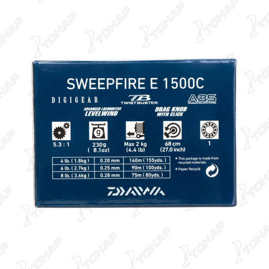 Одной из самых недорогих серий среди безынерционных катушек японской компании Daiwa является линейка под названием Sweepfire EC . В нее входят восемь экземпляров, среди которых имеются модели с передаточным числом 4.6:1 или 5.3:1 и весом от 230 до 630гр. Среди такого широкого выбора всегда можно подобрать катушку, максимально подходящую для использования в ваших условиях. При изготовлении корпуса и ротора использовался прочный, но одновременно достаточно легкий материал. В конструкции установлен один шарикоподшипник, а чтобы ротор не мог случайно провернуться в обратную сторону, имеется стопор обратного хода Multi Stop. Во избежание поломки ручки в то время, когда катушка не используется, ее можно ослабить болтом и приложить к корпусу самой катушки. За один полный оборот рукояти наматывается от 68 до 99см лески. С целью минимизировать образование нежелательных петель и улучшить намотку лески, использована фирменная ABS шпуля с геометрией в виде обратного конуса и специальный ролик лесоукладываетля Twist Buster. В комплекте с катушкой идут: взрыв-схема и инструкция с советами по использованию на нескольких языках (в том числе есть перевод на русский язык). Характеристики Вес, гр: 226 Вид ловли: спиннинг Диаметр переднего бортика шпули, мм: 41 Класс катушки: ultralight Кнопка на рукояти: нет Количество подшипников: 1 Комплектация: Запасной шпули в комплекте нет Нагрузка на фрикцион, кг: 2 Намотка за оборот ручки, см: 68 Объем шпули: 0,25 мм/90м Передаточное число: 5,3:1 Способ крепления рукояти: прижимной винт Тип механизма: планетарный Фрикцион: передний Производитель: Daiwa