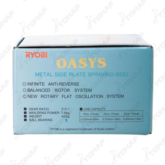 Серия безынерционных катушек Oasys от фирмы Ryobi занимает почетное место в каталоге высококачественных и недорогих катушек этого бренда. Легкий и эргономичный корпус катушек этой серии выполнен из графитового материала и имеет металлическое усиление. Рукоять катушек обладает удобной складывающейся конструкцией при помощи кнопочного фиксатора. Перфорированная металлическая шпуля не подвержена деформации и имеет специальное покрытие из твердого сплава. Передаточный механизм катушек выточен из цельных алюминиевых заготовок. Устройство механизма способствует равномерной подаче шпули и качественной намотке лески. Данная серия наделена сверхточным передним тормозным фрикционом. Дужка лесоукладывателя и ролик изготовлены из износостойкой нержавеющей стали. Полая дужка гарантирует правильное скольжение лески на полузакрытый ролик после заброса. Катушки серии Oasys оснащены стопором обратного хода с мгновенным антиреверсом, что надежно защищает ее от повреждений при критических нагрузках. Ryobi Oasys отлично подойдут для спиннинговой ловли. Характеристики: • Размер: 5000 • Вес, гр.: 425 • Вид ловли: донная/фидерная • Количество подшипников: 5 • Комплектация: Запасной шпули в комплекте нет • Нагрузка на фрикцион, кг.: 7,5 • Объем шпули: 0,330мм/200м, 0,370 мм/160м, 0,405мм/130м • Передаточное число: 5,0:1 • Производитель: RYOBI • Разработана и спроектирована в Японии • Фрикцион: передний. • Тип: безынерционная • Рукоятка с возможностью лево/правосторонней установки Обзор линейки катушек RYOBI OASYS