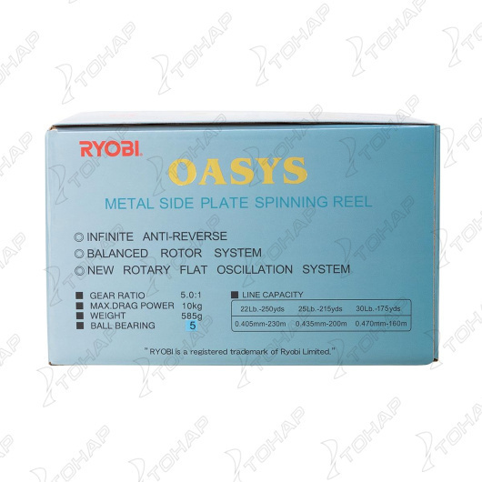 Серия безынерционных катушек Oasys от фирмы Ryobi занимает почетное место в каталоге высококачественных и недорогих катушек этого бренда. Легкий и эргономичный корпус катушек этой серии выполнен из графитового материала и имеет металлическое усиление. Рукоять катушек обладает удобной складывающейся конструкцией при помощи кнопочного фиксатора. Перфорированная металлическая шпуля не подвержена деформации и имеет специальное покрытие из твердого сплава. Передаточный механизм катушек выточен из цельных алюминиевых заготовок. Устройство механизма способствует равномерной подаче шпули и качественной намотке лески. Данная серия наделена сверхточным передним тормозным фрикционом. Дужка лесоукладывателя и ролик изготовлены из износостойкой нержавеющей стали. Полая дужка гарантирует правильное скольжение лески на полузакрытый ролик после заброса. Катушки серии Oasys оснащены стопором обратного хода с мгновенным антиреверсом, что надежно защищает ее от повреждений при критических нагрузках. Ryobi Oasys отлично подойдут для спиннинговой ловли. Характеристики: • Размер: 8000 • Вес, гр.: 605 • Вид ловли: донная/фидерная, карповая • Шариковый подшипник: 5 • Комплектация: Запасной шпули в комплекте нет • Нагрузка на фрикцион, кг.: 10 • Объем шпули: 0,405мм/230 м, 0,435 мм/200 м, 0,470 мм/160 м • Передаточное число: 5,0:1 • Производитель: RYOBI • Разработана и спроектирована в Японии • Фрикцион: передний. • Тип: безынерционная • Рукоятка с возможностью лево/правосторонней установки Обзор линейки катушек RYOBI OASYS