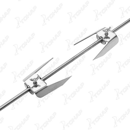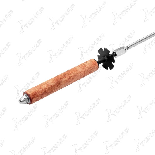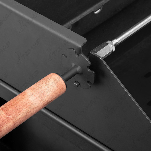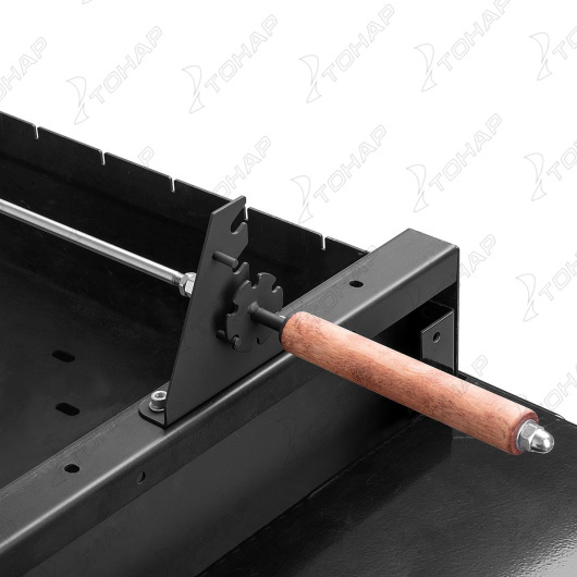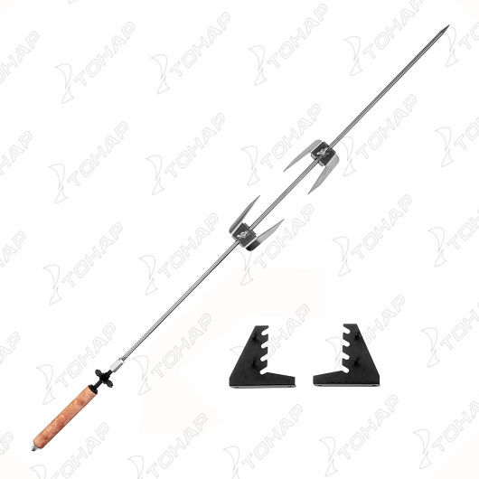 Шампур вертела изготовлен из нержавеющей стали (диаметр 8 мм), укомплектован шайбой для изменения угла поворота и фиксации, двумя прижимными вилками с фиксаторами. Ненагревающаяся рукоятка выполнена из древесины твердых пород.
