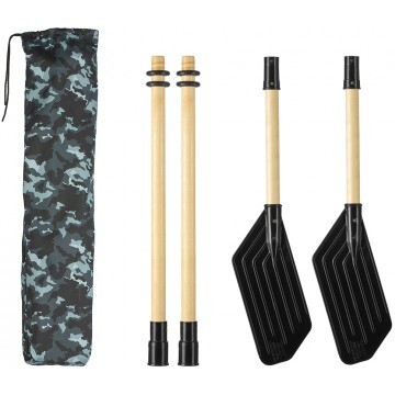 Весло в сборе комплектуется березовой рукояткой с многослойным защитно-декоративным покрытием. Используется узел соединения, который состоит из двух пластмассовых трубок разного диаметра, жестко фиксирующихся подпружиненным фиксатором. Сбор весла с таким узлом занимает не более секунды, а надежность соединения не уступает резьбовому. Комплект сборных весел упаковывается в тканевый чехол. Каждое весло комплектуется двумя резиновыми кольцами для фиксации в уключине. Преимущества весел типа "Клюшка" по сравнению с обычными: • Более эффективная гребля с приложением меньших усилий по сравнению с обычной лопастью. • При перемещении по заросшим водоемам растительность не наматывается на весло • Существенно облегчается перемещение по мелководью Характеристики: • Длина весла в собранном виде - 1300 мм Комплект состоит из двух штук весел.