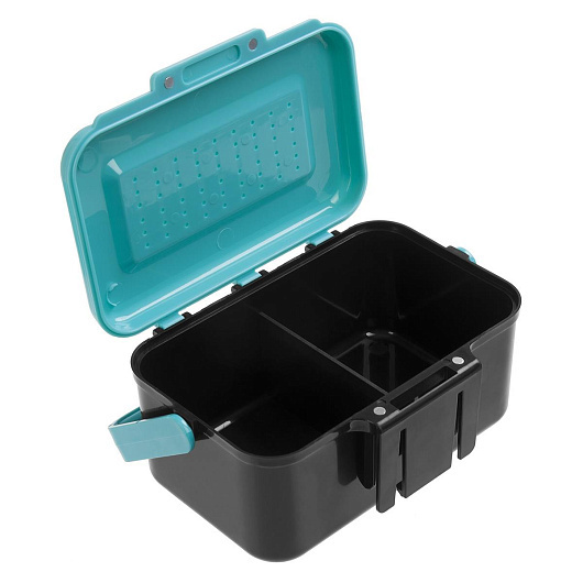 Компактная прямоугольная коробочка с крышкой и ручкой прекрасно подойдет для хранения и переноса живой наживки. В коробочке предусмотрены перфорированная крышка на магнитах, два отделения, съемный поддон (7,5*7,5 см) с пластиковым пинцетом. Коробочку можно носить на поясе (есть сперицальное крепление) Характеристики: Длинна, см.:14 Ширина, см.:11 Высота,см: 7,0 Цвет: черный/бюрюзовый