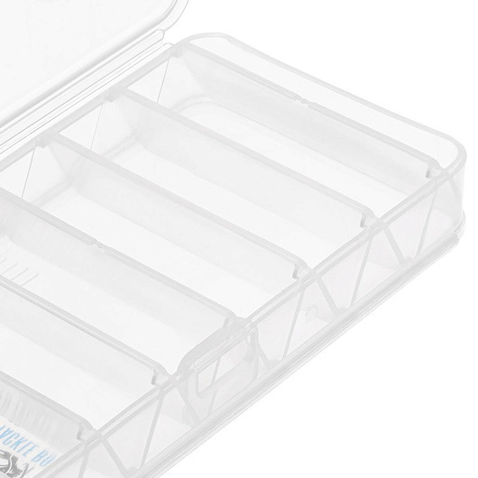 Удобная коробка под снасти, выполнена из прочного матового пластика. В коробке предусмотрено двухстороннее размещение приманок, по семь ложементов с каждой стороны. Очень удобна независимым открытием отсеков. Компактный размер позволяет брать её с собой. Характеристики: Цвет: белый. Размеры: 7.7 х 15.3 х 2.6 см. Материал: пластик. Вес: 75 г.