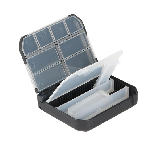 Универсальная пластиковая коробка для рыболовных снастей. Коробка выполнена в форме книжки. Удобные пазы для открывания отделений. Прочный пластик. Характеристики: Размер: 12,2х9,7х4 см Материал: пластик.