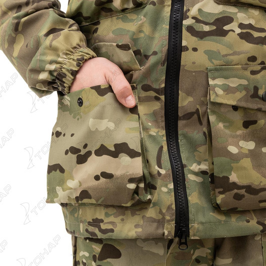 Универсальный легкий костюм Тайфун Helios из мягкой и бесшумной ткани подходит для любого вида отдыха на природе в летний период: для охоты, рыбалки, путешествий, прогулок в лесу. Отлично подойдет для военизированных игр (пейнтбола, страйкбола и др.). Прочный и дышащий смесовый материал твил с пич-эффектом, создает особую мягкость и бархатистость поверхности костюма. Изделие из такой ткани обладает высокой износостойкостью и не теряет цвет. Костюм состоит из удлиненной куртки и брюк, с поясом на эластичной ленте. Ширина брюк по нижней части регулируется кулисой. Эргономичный крой обеспечивает свободу и комфорт движений. Съемная противомоскитная сетка, защищающая лицо, пристегивается при необходимости на молнию к капюшону. Маскировочный эффект и практичность в носке создает специальный камуфлированный принт. Материал: Ткань смесовая твил (35% хлопок/65% полиэстер) с Peach эффектом Цвет: Мультикам Размер: 36-38/140-146 ОСОБЕННОСТИ • Удлиненная куртка с центральной застежкой на молнию • Капюшон с регулировкой по объему • Съемная противомоскитная сетка убирается в нагрудный карман • Низ рукавов куртки оформлен эластичной манжетой • 4 объемных кармана с клапаном на кнопке на куртке, 2 кармана на брюках • Брюки свободного кроя выполнены на поясе с эластичной резинкой и шлевками под ремень. • По низу ширина брюк регулируется кулисой. *В зависимости от партии ткани внешний вид изделия и цвет может незначительно отличаться от представленных изображений.