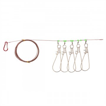 Универсальный 5-тиместный кукан предназначен для сохранения рыбы живой в течение всего времени рыбалки. Изготовлен из металлического троса и 5 прочных металлических звеньев-застежек, которые установлены на трос через надежные вертлюжки. Надежный карабин позволяет быстро прикрепить кукан к прочной ветке, колышку на берегу или к лодке.