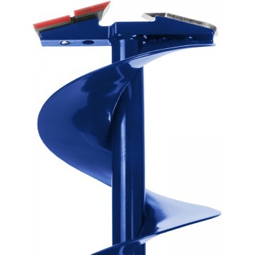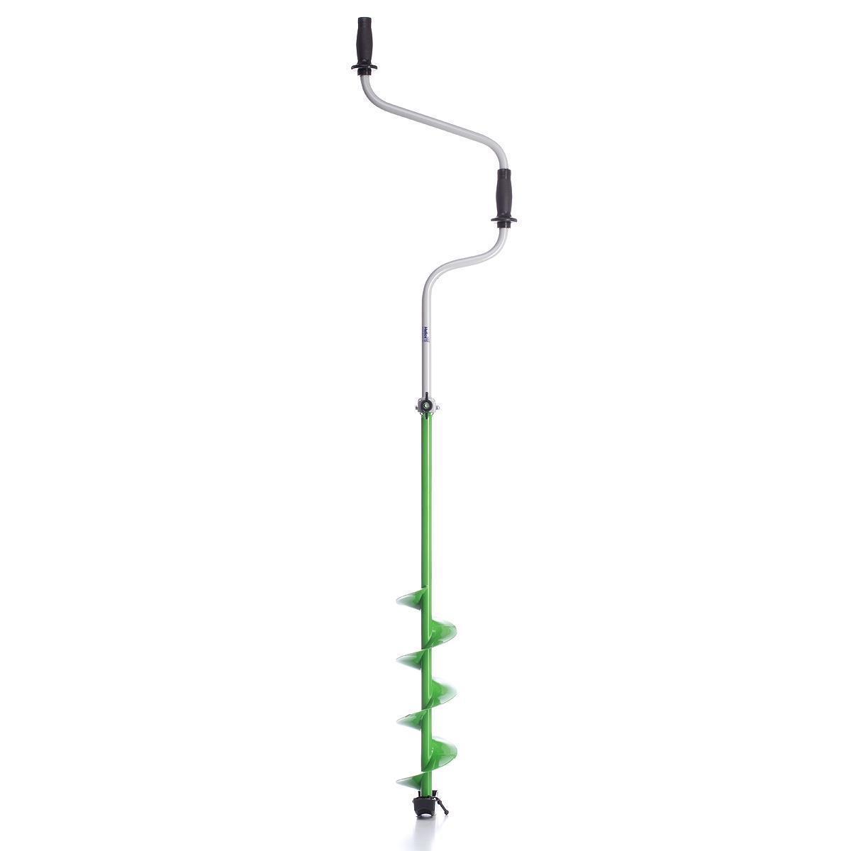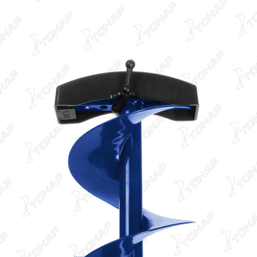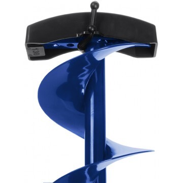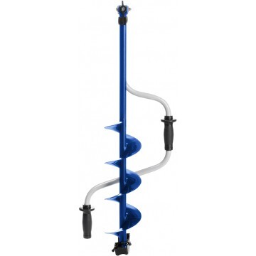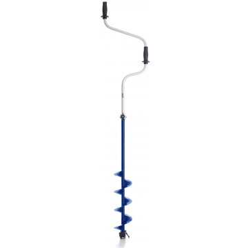 Верхняя рукоятка ледобура смещена относительно оси ледобура на 130 мм, а нижняя на 150 мм. Такое расположение рукояток позволяет вращать ледобур одновременно двумя руками, тем самым, увеличивая скорость бурения лунок во льду.