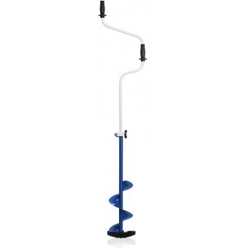 Верхняя рукоятка ледобура смещена относительно оси шнека на 130 мм, а нижняя на 150 мм. Такое расположение рукояток позволяет вращать ледобур одновременно двумя руками, тем самым, не прикладывая особых усилий, увеличивая скорость бурения лунок во льду.