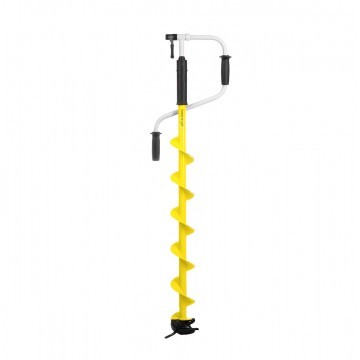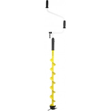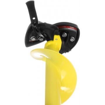 Верхняя и нижняя рукоятки ледобура смещены относительно оси шнека. Такое расположение рукояток позволяет вращать ледобур одновременно двумя руками, ход бура плавный, бурит без усилий.