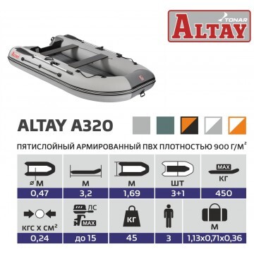 Моторная лодка «АЛТАЙ А320» - это облегченная версия лодок серии "АЛТАЙ" производства ГК «ТОНАР» . Надежная конструкция выполнена из пятислойного армированного ПВХ плотностью 900 г/м2, три герметичных отсека и надувное дно гарантируют вашу безопасность на воде. Надувное дно низкого давления с увеличенной килеватостью обеспечивает исключительную управляемость лодки. Лодка плавно проходит волну и выходит в режим глиссирования за 3,5 секунды. Лодка обладает улучшенной остойчивостью, что по праву оценят спиннингисты, которые часто ведут ловлю стоя. Вес полного комплекта – всего 35 кг. Компактно упаковывается в одну сумку, что позволяет перевозить лодку в багажнике любого автомобиля. Характеристики «АЛТАЙ А320»: Длина наибольшая - 320 см. Ширина наибольшая - 169 см. Длина кокпита - 217 см. Ширина кокпита - 75 см. Диаметр баллона - 47 см. Давление в баллонах/днище - 0,24 бар. Число надувных элементов - 3+дно. Грузоподъемность - 450 кг. Пассажировместимость - 3 +1 человека. Толщина транца - 18 мм. Число банок - 2. Толщина банки – 25 мм. Масса изделия в комплекте - 35,9 кг. Максимальная мощность двигателя - 15 л.с. Максимальный вес двигателя - 42 кг. Размер упаковки - 100х67х32 см. Лодка поставляется со стандартным набором комплектующих: • Ножной насос 5 л. • 2 весла с держателями весла в уключине. • 2 жестких сиденья. • Сумка упаковочная. • Ремкомплект и руководство по эксплуатации (паспорт). Особенности конструкции: • Транец и банки изготовлены из специальной влагостойкой фанеры, которая абсолютно не впитывает влагу. • Система ликтрос-ликпаз позволяет разместить их в кокпите лодки по своему усмотрению. • Изготовленные из полипропилена леера лодки закреплены в надежных шайбах и обеспечивают максимальную нагрузку при закреплении за них якорной веревки и дополнительного снаряжения. • Лодка оснащена двумя жесткими ручками на булях лодки и ручкой-рымом в носовой части, которые позволяют переносить лодку, не травмируя кисть, а также буксировать лодку. Кроме этого, имеется ручка шкипера, позволяющая безопасно управлять лодкой. • Складные алюминиевые весла с гребками из прочного пластика с дополнительным фиксатором, позволяющим установить весло на уключину. На бортах лодки установлены держатели весла, которые надежно фиксируют весла во время движения. • Косынки-брызгоотбойники, расположенные по направлению от транца к булям, предотвращают попадание воды в кокпит. • Особенная конструкция реборды позволяет не только защитить лодку с боков во время швартовки, но и закреплять крючки дополнительного оборудования, например, носовых и стояночных тентов. • Сливной клапан позволит быстро извлечь воду из кокпита во время движения. Обзор лодки "Алтай А320"