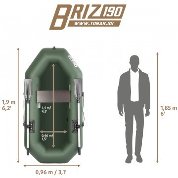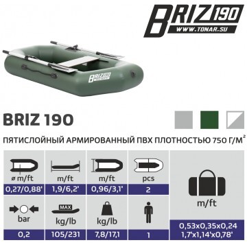 Сверхлегкая и компактная гребная лодка "БРИЗ 190" производства ГК "ТОНАР" из ПВХ предназначена для рыбной ловли и охоты на закрытых водоёмах. Лодка укомплектована алюминиевыми веслами. Баллон разделен воздухонепроницаемыми перегородками на два независимых отсека таким образом, чтобы в случае выхода из строя одного из отсеков гребная лодка сохраняла положение равновесия. Характеристики лодки «Бриз 190»: • Длина лодки наибольшая: 1,90 м. • Ширина наибольшая: 0,96 м. • Длина кокпита: 1,4 м. • Длина кокпита: ,46 м. • Диаметр баллона наибольший: 0,27 м. • Грузоподъемность: 105 кг. • Пассажировместимость: 1 человек. • Рабочее давление в баллоне: 0,2 кгс/см2. • ПВХ-ткань: 750 г/м.кв. • Упаковка: сумка-рюкзак. • Вес комплекта: 7,8 кг. • Размер упаковки - 67х35х20 см. • Сиденье: банка из влагостойкой фанеры. Лодка поставляется со стандартным набором комплектующих: • Ножной насос 3 л. • 2 весла с держателями весла в уключине. • Одно жесткое сиденье. • Сумка для хранения и перевозки. • Ремкомплект и руководство по эксплуатации (паспорт).