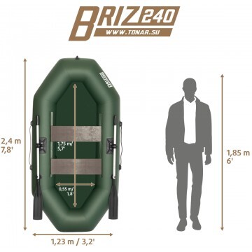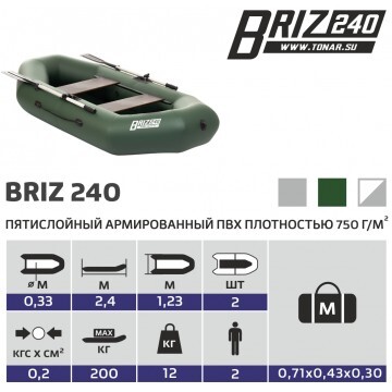 Надувная лодка «БРИЗ 240» производства ГК "ТОНАР" двухместная лодка с классической О-образной формой. Баллон лодки разделен перегородками на 2 независимых отсека, что гарантирует безопасность пребывания на воде. На лодке используется современная и надежная фурнитура отечественных производителей. Лодка «БРИЗ 240» идеально подойдет как для любителей рыбалки и охоты, так и для прогулок и отдыха на воде. Рекомендованные районы плавания: закрытые акватории, небольшие озера, реки. Характеристики лодки «БРИЗ 240»: Длина наибольшая: 2,40 м. Ширина наибольшая: 1,23 м. Диаметр баллона наибольший: 0,33 м. Вес комплекта: 11.3 кг. Размер упаковки - 76х38х20 см. Грузоподъемность: 200 кг. Пассажировместимость: 2 человека. Количество герметичных отсеков: 2 шт. Рабочее давление в баллоне: 0,2 кгс/см2. Материал: пятислойный ПВХ 750 гкв.м. Цвет: зеленый. Лодка поставляется со стандартным набором комплектующих: • Ножной насос 5 л. • 2 весла с держателями весла в уключине. • 2 жестких сиденья. • Сумка-рюкзак для хранения и перевозки. • Ремкомплект и руководство по эксплуатации (паспорт).