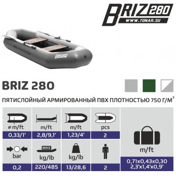 Надувная лодка «БРИЗ 280» производства ГК "ТОНАР" двухместная лодка с классической О-образной формой. Баллон лодки разделен перегородками на 2 независимых отсека, что гарантирует безопасность пребывания на воде. Просторный кокпит позволит свободно разместиться двум пассажирам и при этом удобно расположить необходимый груз. На лодке используется современная и надежная фурнитура отечественных производителей. Лодка идеально подойдет как для любителей рыбалки и охоты, так и для прогулок и отдыха на воде. Рекомендованные районы плавания: закрытые акватории, небольшие озера, реки. Характеристики лодки «БРИЗ 280»: Длина наибольшая: 2,80 м. Ширина наибольшая: 1,23 м. Диаметр баллона наибольший: 0,33 м. Масса изделия в комплекте: 12,2 кг. Грузоподъемность: 220 кг. Пассажировместимость: 2 человека. Количество герметичных отсеков: 2 шт. Рабочее давление в баллоне: 0,2 кгс/см2. Материал: пятислойный ПВХ 750 гкв.м. Цвет: серый. Лодка поставляется со стандартным набором комплектующих: • Ножной насос 5 л. • 2 весла с держателями весла в уключине. • 2 жестких сиденья, сумка-рюкзак для хранения и перевозки. • Ремкомплект и руководство по эксплуатации (паспорт).