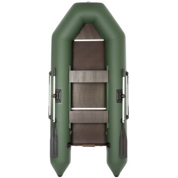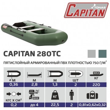 Лодка «КАПИТАН 280Тс» производства ГК «ТОНАР» оснащена стационарным транцем толщиной 14 мм, на который можно установить мотор мощностью до 4 л.с. Транец гармонично сочетается с общей компоновкой лодки, обладает достаточной прочностью и выдерживает статические нагрузки от веса мотора и динамические нагрузки, возникающие при эксплуатации надувной моторной лодки (от упора винта, вибрации, ударов при наезде на подводные препятствия и при реверсировании). Транец надежно вклеен в корпус лодки с использованием специального усилителя-фиксатора транца. Характеристики лодки «КАПИТАН 280Тс»: Длина наибольшая: 2,80 м. Ширина наибольшая: 1,23 м. Длина кокпита: 193 м. Ширина кокпита: 0,55 м. Диаметр баллона наибольший: 0,34 м. Транец: стационарный. Мощность двигателя: до 4 л.с. Масса изделия в комплекте: 21,5 кг. Размер упаковки - 78х58х25 см. Грузоподъемность: 210 кг. Пассажировместимость: 2 человека. Количество герметичных отсеков: 2 шт. Рабочее давление в баллоне: 0,2 кгс/см2. Плотность ПВХ-ткани: 750 г/м.кв. Цвет: зеленый. Лодка поставляется со стандартным набором комплектующих: • Ножной насос 5 л. • 2 весла с держателями весла в уключине. • 2 жестких сиденья. • Пол-книжка (4 секции жесткого настила, толщина 6 мм). • Сумка для хранения и перевозки. • Ремкомплект и руководство по эксплуатации (паспорт). Лодка оснащена жестким вставным дном типа «книжка», изготовленным из влагостойкой фанеры с противоскользящим покрытием. Банки крепятся к бортам лодки по системе ликтрос-ликпаз.