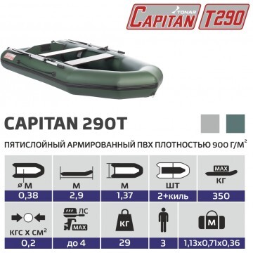 Моторно-гребная лодка «КАПИТАН Т290» производства ГК «ТОНАР» - это легкая и вместительная лодка по привлекательной цене! Просторный кокпит лодки и грузоподъемность до 350 кг позволяют комфортно разместиться 3 пассажирам и расположить весь необходимый груз. За счет оснащения лодки килеватым днищем улучшается ее управляемость, обеспечивается плавное всхождение на волну, что позволяет уверенно глиссировать с мотором до 5 л.с. Рекомендованные районы плавания: прибрежная зона, реки и озера. Стандартная комплектация лодки «КАПИТАН Т290» включает в себя жесткий сборный пайол (толщиной 6 мм), который легко собирается при помощи специальных алюминиевых профилей. Пол, изготовленный из водостойкой фанеры с противоскользящим покрытием, позволяет уверенно перемещаться в лодке и рыбачить стоя. Крепление сидений ликтрос–ликпаз позволяет регулировать банки в большом диапазоне, что обеспечивает удобство размещения людей и груза в лодке. Лодка «КАПИТАН Т290» оснащена привальным брусом, защищающим боковую часть бортов при швартовке. По бортам лодки размещены ручки для ее переноски. Высококачественные клапана позволяют быстро надуть/ сдуть лодку и являются надежной защитой от стравливания воздуха. В сложенном состоянии лодка перевозится в одной упаковочной сумке. Характеристики лодки «КАПИТАН Т290»: Материал: ПВХ-ткань 900 г/м.кв. Длина лодки - 2,9 м. Ширина - 1,37 м. Диаметр баллона - 0,36 м. Длина кокпита - 1.95 м. Ширина кокпита - 0,65 м. Максимальная мощность двигателя - до 5 л.с. Масса изделия в комплекте - 29.9 кг. Грузоподъемность - 350 кг. Пассажировместимость - 3 человека. Количество герметичных отсеков - 2 + киль. Рабочее давление в баллоне - 0,2 кгс/см2. Габариты лодки в упаковке: 90х70х27 cм. Цвет: зеленый. Лодка поставляется со стандартным набором комплектующих: • ножной насос 5 л; • 2 весла с держателями весла в уключине; • 2 жестких сиденья; • жесткий пайол с алюминиевыми профилями; • сумка для хранения и перевозки; • ремкомплект и руководство по эксплуатации (паспорт). Возможности лодки КАПИТАН Т290 (с мотором TOHATSU на 5 л./с.):