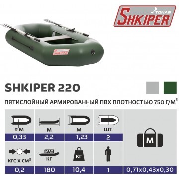 Надувная одноместная лодка «ШКИПЕР 220» производства ГК «ТОНАР» с классической О-образной формой и просторным кокпитом позволит Вам с комфортом провести время на воде. Выверенные обводы корпуса лодки обеспечивают легкий ход под веслами, отличную маневренность, устойчивость и управляемость. Небольшой вес, компактность при транспортировке, быстрота и легкость сборки лодки делают ее популярной среди рыбаков и охотников. Характеристики лодки «ШКИПЕР 220»: • Длина наибольшая: 2,2 м. • Ширина наибольшая: 1,23 м. • Длина кокпита: 1,52 м. • Ширина кокпита: 0,55 м. • Диаметр баллона наибольший: 0,33 м. • Вес комплекта: 10,1 кг. • Размер упаковки - 75х40х22 см. • Грузоподъёмность: 180 кг. • Пассажировместимость: 1 чел. • Количество герметичных отсеков: 2 шт. • Рабочее давление в баллоне: 0,2 кгс/см2. • Ткань ПВХ (пятислойный): 750 г/м2. Лодка поставляется со стандартным набором комплектующих: • Ножной насос 3 л. • 2 весла с держателями весла в уключине. • 1 жесткое сиденье. • Сумка для хранения и перевозки. • Ремкомплект и руководство по эксплуатации (паспорт).