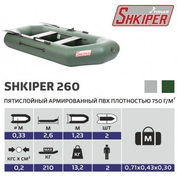 Надувная гребная лодка «ШКИПЕР 260» производства ГК «ТОНАР» имеет классическую О-образную форму и вместительный кокпит, который позволит не только комфортно разместиться 2 пассажирам, но и удобно расположить необходимый груз. Выверенные обводы корпуса лодки обеспечивают легкий ход под веслами, отличную маневренность, устойчивость и управляемость. Небольшой вес, компактность при транспортировке, быстрота и легкость сборки лодки делают ее популярной среди рыбаков и охотников. Крепление сидений сделано по системе ликтрос-ликпаз, что позволяет перемещать банки на необходимое расстояние. Технические характеристики лодки "ШКИПЕР 260": • Длина наибольшая - 2,60 м. • Ширина наибольшая - 1,23 м. • Длина кокпита - 1,96 м. • Ширина кокпита - 0,55 м. • Диаметр баллона наибольший - 0,33 м. • Масса изделия в комплекте – 12,3 кг. • Грузоподъемность - 210 кг. • Пассажировместимость - 2 человека. • Количество герметичных отсеков - 2 шт. • Рабочее давление в баллоне - 0,2 кгс/см2. • Размер упаковки - 75х40х25 см. • Материал: пятислойный ПВХ 750 г\кв.м. Лодка поставляется со стандартным набором комплектующих: • Ножной насос 5 л. • 2 весла с держателями весла в уключине. • 2 жестких сиденья. • Сумка для хранения и перевозки. • Ремкомплект и руководство по эксплуатации (паспорт).
