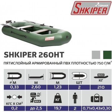 Надувная лодка «ШКИПЕР 260 НТ» производства ГК «ТОНАР» оснащена навесным транцем, который предназначен для моторов мощностью до 2,5 л.с. Оснащение лодки мотором расширяет географию поездок и район использования лодки. За счет измененной формы кормы значительно увеличено внутреннее пространство лодки, что позволит не только комфортно разместиться пассажирам, но и удобно расположить необходимый груз. Характеристики лодки «ШКИПЕР 260 НТ»: • Длина наибольшая: 2,6 м. • Ширина наибольшая: 1,23 м. • Длина кокпита: 1,96 м. • Ширина кокпита: 0,55 м. • Диаметр баллона наибольший: 0,33 м. • Масса изделия в комплекте: 17,4 кг. • Грузоподъёмность: 210 кг. • Пассажировместимость: 2 чел. • Количество герметичных отсеков: 2 шт. • Тип транца: навесной. • Макс.мощность мотора: до 2,5 л.с. • Макс. вес мотора: 17,5 кг. • Тип дна: реечная слань. • Рабочее давление в баллоне: 0,2 кгс/см2. • Ткань ПВХ (пятислойный): 750 г/м2. Лодка поставляется со стандартным набором комплектующих: • Ножной насос 5 л. • 2 весла с держателями весла в уключине. • 2 жестких сиденья. • Реечная слань. • Навесной транец. • Сумка для хранения и перевозки. • Ремкомплект и руководство по эксплуатации (паспорт). Стандартная комплектация «ШКИПЕР 260 НТ» включает в себя реечный настил, позволяющий уверенно перемещаться в лодке и рыбачить стоя. Небольшой вес, компактность при транспортировке, быстрота и легкость сборки лодки делают ее популярной среди рыбаков и охотников.