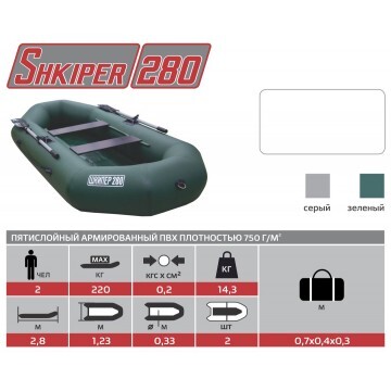 Надувная лодка «ШКИПЕР 280» производства ГК «ТОНАР» классической О-образной формы имеет увеличенное внутреннее пространство, благодаря чему в лодке можно комфортно разместиться 2 пассажирам и удобно расположить весь необходимый груз. Выверенные обводы корпуса лодки обеспечивают легкий ход под веслами, отличную маневренность, устойчивость и управляемость. Небольшой вес, компактность при транспортировке, быстрота и легкость сборки лодки делают ее популярной среди рыбаков и охотников. Лодка может комплектоваться реечной сланью из влагостойкой фанеры с противоскользящим покрытием, которая позволяет устойчиво стоять даже при стрельбе во время охоты. Технические характеристики лодки "ШКИПЕР 280": • Длина наибольшая - 2,80 м. • Ширина наибольшая - 1,23 м. • Длина кокпита - 2,15 м. • Ширина наибольшая - 0,55 м. • Диаметр баллона наибольший - 0,33 м. • Масса изделия в комплекте – 12,6 кг. • Грузоподъемность - 220 кг. • Пассажировместимость - 2 человека. • Количество герметичных отсеков - 2 шт. • Рабочее давление в баллоне - 0,2 кгс/см2. • Вес изделия: 13,7 кг. • Размер упаковки - 83х42х20 см. • Материал: пятислойный ПВХ 750г\кв.м. Лодка поставляется со стандартным набором комплектующих: • ножной насос 5 л; • 2 весла с держателями весла в уключине; • 2 жестких сиденья; • сумка для хранения и перевозки; • ремкомплект и руководство по эксплуатации (паспорт). <