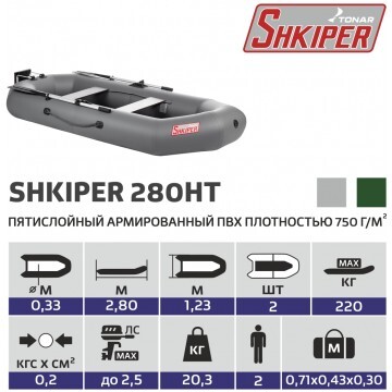 Надувная лодка «ШКИПЕР 280НТ» производства ГК «ТОНАР» оснащена навесным транцем, который предназначен для моторов мощностью до 2,5 л.с. Оснащение лодки мотором расширяет географию поездок и район использования лодки. За счет измененной формы кормы значительно увеличено внутреннее пространство лодки, что позволит не только комфортно разместиться пассажирам, но и удобно расположить необходимый груз. Характеристики лодки «ШКИПЕР 280НТ»: • Длина наибольшая: 2,8 м. • Ширина наибольшая: 1,23 м. • Длина кокпита: 2,15 м. • Ширина кокпита: 0,55 м. • Диаметр баллона наибольший: 0,33 м. • Масса изделия в комплекте: 17,6 кг. • Грузоподъёмность: 220 кг. • Пассажировместимость: 2 чел. • Количество герметичных отсеков: 2 шт. • Тип транца: навесной. • Мощность двигателя: до 2,5 л.с. • Тип дна: реечная слань. • Рабочее давление в баллоне: 0,2 кгс/см2. • Ткань ПВХ (пятислойный): 750 г/м2. • Габариты лодки в упаковке: 82х43х30 см. Лодка поставляется со стандартным набором комплектующих: • Ножной насос 5 л. • 2 весла с держателями весла в уключине. • 2 жестких сиденья. • Реечная слань. • Навесной транец. • Сумка для хранения и перевозки. • Ремкомплект и руководство по эксплуатации (паспорт). Стандартная комплектация «ШКИПЕР 280 НТ» включает в себя реечный настил, позволяющий уверенно перемещаться в лодке и рыбачить стоя. Небольшой вес, компактность при транспортировке, быстрота и легкость сборки лодки делают ее популярной среди рыбаков и охотников.