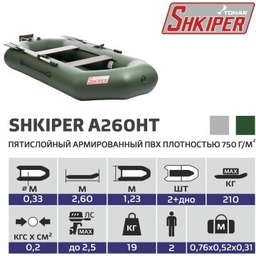Лодка «ШКИПЕР А260НТ» производства ГК «ТОНАР» создана на базе лодки «ШКИПЕР 260НТ» с навесным транцем и оснащена надувным дном низкого давления. Корпус лодки выполнен из пятислойного армированного ПВХ (750г/м.кв). Технические характеристики лодки: • Длина наибольшая: 2,6 м. • Ширина наибольшая: 1,23 м. • Длина кокпита: 1,96 м. • Ширина кокпита: 0,55 м. • Диаметр баллона наибольший: 0,33 м. • Масса изделия в комплекте: 17,1 кг. • Грузоподъёмность: 210 кг. • Пассажировместимость: 2 чел. • Количество герметичных отсеков: 2 шт. • Тип транца: навесной. • Макс.мощность мотора: до 2,5 л.с. • Макс. вес мотора: 17,4 кг. • Тип дна: реечная слань. • Рабочее давление в баллоне: 0,2 кгс/см2. • Ткань ПВХ (пятислойный): 750 г/м2. Лодка поставляется со стандартным набором комплектующих: • Ножной насос 5 л. • 2 весла с держателями весла в уключине. • 2 жестких сиденья. • Навесной транец. • Сумка для хранения и перевозки. • Ремкомплект и руководство по эксплуатации (паспорт). Преимущества лодки "ШКИПЕР А260НТ" с надувным дном: • неглубокая осадка; • дополнительная теплоизоляция в холодную погоду; • амортизация (надувное дно принимает на себя удары волн, снижая тем самым вибрации всего корпуса).