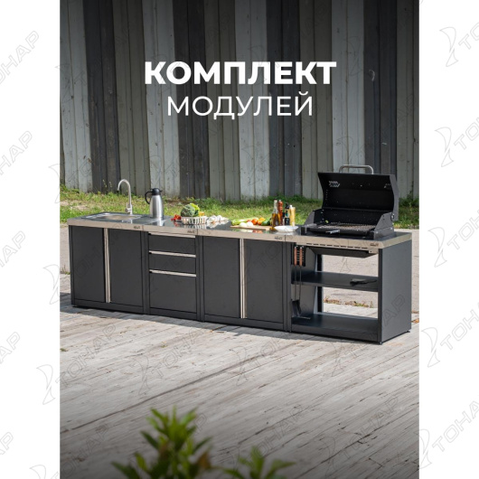 Модульные уличные кухни Helios SMART - идеальные решения для обустройства вашей летней кухни с мангальной зоной и создания комфортных условий приготовления пищи на открытом воздухе без компромиссов. Уличная кухня может быть не менее стильной, удобной и технологичной, чем обычная. Кухню Helios SMART можно наилучшим образом адаптировать под ваши персональные запросы и бюджет, выбрав модули с теми функциями, которые планируете использовать постоянно, чтобы получить максимум пользы. Модуль уличной кухни HELIOS SMART-900 Шкаф с мойкой представляет собой столешницу, изготовленную из пищевой нержавеющей стали и встроенную в нее глубокую мойку. Каркас модуля выполнен из высококачественной стали с прочным полимерным покрытием. Модуль закрывается двумя дверками на магнитных фиксаторах. Высота модуля регулируется с помощью специальных ножек. Каждая деталь модулей, от фасадных элементов до столешницы, отличается устойчивостью к внешним погодным условиям. Модуль уличной кухни HELIOS SMART-900 Шкаф с мойкой стал победителем регионального конкурса "Лучший товар - Алтай 2025". Преимущества модуля: - Столешница из пищевой нержавеющей стали - Надежное полимерное покрытие каркаса - Регулируемые по высоте ножки - Легко монтируемая задняя стенка - Ручки выполнены из текстурированной нержавеющей стали - Вместительная мойка из нержавеющей стали - Удобные дверки с магнитными фиксаторами - Модуль имеет свободное внутреннее пространство для размещения мусорного ведра - Для установки нескольких модулей уличной кухни вплотную друг к другу в боковых стенках модулей предусмотрена дополнительная система креплений Характеристики: Высота модуля – 850 мм Глубина модуля – 600 мм Ширина модуля - 900 мм Длина мойки - 400 мм Ширина мойки - 500 мм Высота мойки - 160 мм Глубина чаши мойки - 14,5 мм Материал корпуса модуля (столешница) – 1 мм, нержавеющая сталь. Материал корпуса модуля (боковые стенки) – сталь 1,5 мм, полимерное покрытие. Материал корпуса модуля (дверки, задняя стенка, полка) – сталь 1 мм, полимерное покрытие. Материал корпуса модуля (цоколь) – сталь 2 мм, полимерное покрытие. Материал мойки – 0,5 мм, нержавеющая сталь. Материал столешницы: пищевая нержавеющая сталь Вес модуля в сборе - 46 (± 0,5) кг Цвет корпуса модуля: satura black-grey (черный-серый) Комплектация: 1. Стенки каркаса – 2 шт. 2. Столешница – 1 шт. 3. Полка – 1 шт. 4. Цоколь – 2 шт. 5. Панель задней стенки – 2 шт. 6. Дверка – 2 шт. 7. Ножки регулируемые – 4 шт. 8. Шарнир пружины – 8 шт. 9. Магнитный кронштейн – 1 шт. 10. Крепежи установочный – 8 шт. 11. Мойка – 1 шт. *смеситель и гофра в комплект модуля не входят. Крепежные элементы : 1. Винт М6x16 — 16 шт. 2. Шайба 6 — 20 шт. 3. Гайка М6 — 4 шт. 4. Винт М4х10 — 2 шт. 5. Ключ рожковый S=10/17 — 1 шт. 6. Ключ под внутренний шестигранник S=5 — 1 шт. 7. Заглушка пластикова - 6 шт. Модульные уличные кухни HELIOS SMART прошли добровольную сертификацию продукции, что подтверждено Сертификатом соответствия № POCC RU.SSK10.H00169/25, срок действия с 25.02.2025 по 24.02.2028