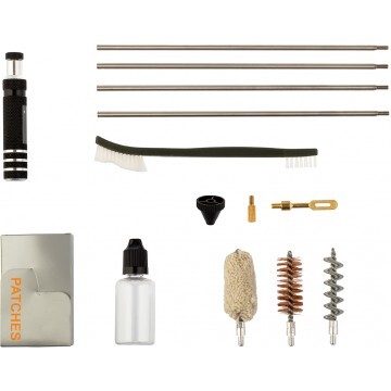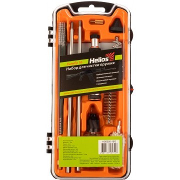 Набор для чистки Helios 16кал. 11 предм., плас. кор. HS6050-16G: Шомпол разбороный, ручка шомпола, ершик бронзовый, ершик хлопковый, ершик стальной спиральный, капроновая щётка, вишер латунный, напрвляющий конус для защиты дульного среза, маслёнка, патчи, адаптер резьбы. Коробка с блистером.