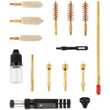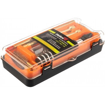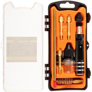 Набор для чистки пистолета Helios 14 предм., плас. кор. HS6055: Шомпол разбороный, ручка шомпола, ершик бронзовый 3шт, ерш ик хлопковый 3шт, вишер пластиковый, вишер-игла для войлочных патчей 3шт, напрвляющий конус для защиты дульного среза, маслёнка.Коробка с блистером.