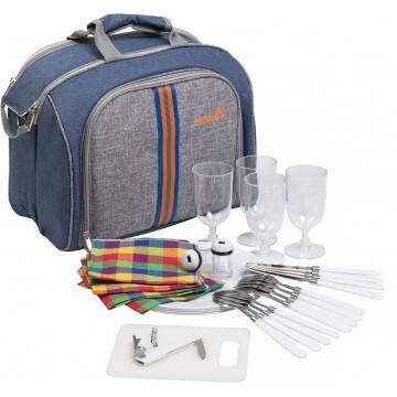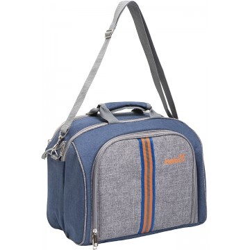 Набор для пикника на 4 персоны торговой марки Helios включает все самое необходимое. Набор также прекрасно подойдет в качестве подарка. Сумку отличает стильный и эргономичный дизайн: удобная ручка, наплечный ремень, термоизолированное отделение под продукты, которое удобно закрывается на две молнии. На передней части сумки расположено отделение с предметами набора. Сверху все предметы закреплены на резинки-фиксаторы, снизу помещаются в сетчатые кармашки. Предметы набора выполнены из пищевой стали, матового и белого пластика. Набор рассчитан на 4 персоны: • 4 тарелки • 4 пластиковые фужера • 4 ложки • 4 вилки • 4 ножа • 1 солонка • 1 перечница • 1 штопор-открывашка • 4 салфетки • 1 доска разделочная • большое теплоизолированное основное отделение под продукты Характеристики: • Материал сумки: Полиэстер 600 D (PVC coating) • Основной цвет сумки: синий/серый • Отделка: оранжевый • Размеры: 41х18х25см • Вес: 1,75 кг