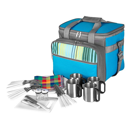 Набор для пикника на 4 персоны (HS-811(4)BG) Helios Набор для пикника Helios позволит комфортно отдохнуть с друзьями и семьей на природе. Удобный и компактный, он не займет много места при транспортировке, при этом в нем есть все, самое необходимое для отличного пикника на свежем воздухе. КОМПЛЕКТАЦИЯ • 4 тарелки • 4 кружки из нержавеющей стали • 4 ложки • 4 вилки • 4 ножа • 1 разделочный нож • 1 штопор-открывашка • 1 доска разделочная • 1 солонка • 1 перечница • 1 скатерть • 4 салфетки • Большое теплоизолированное основное отделение под продукты ХАРАКТЕРИСТИКИ • Материал сумки: Полиэстер 600 D • Материал столового набора: пищевой пластик, нержавеющая сталь • Размеры: 35х25х30 см • Объем кружки: 200 мл • Размер тарелки: 22 см • Объем отделения под продукты: 20 л • Вес: 2,3 кг