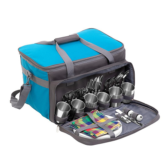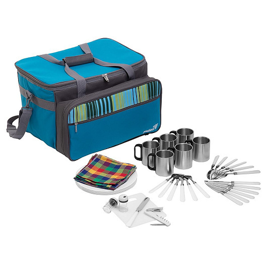 Набор для пикника на 6 персон (HS-811(6)BG) Helios Набор для пикника Helios позволит комфортно отдохнуть с друзьями и семьей на природе. Удобный и компактный, он не займет много места при транспортировке, при этом в нем есть все, самое необходимое для отличного пикника на свежем воздухе. КОМПЛЕКТАЦИЯ • 6 тарелок • 6 кружек из нержавеющей стали • 6 ложек • 6 вилок • 6 ножей • 1 разделочный нож • 1 штопор-открывашка • 1 доска разделочная • 1 солонка • 1 перечница • 6 салфеток • Большое теплоизолированное основное отделение под продукты ХАРАКТЕРИСТИКИ • Материал сумки: Полиэстер 600 D • Материал столового набора: пищевой пластик, нержавеющая сталь • Размеры: 42х30х32 см • Объем кружки: 200 мл • Размер тарелки: 22 см • Объем отделения под продукты: 20 л • Вес: 3,0 кг
