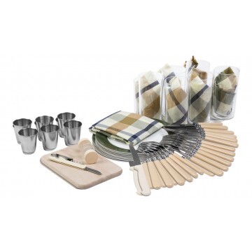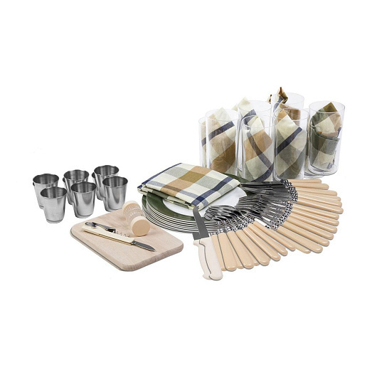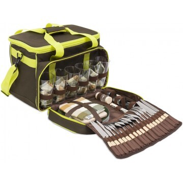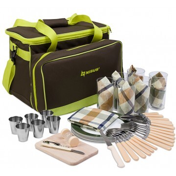 Набор для пикника NA-811 (6) NISUS позволит комфортно отдохнуть с друзьями и семьей на природе. Удобный и компактный, он не займет много места при транспортировке, при этом в нем есть все, самое необходимое для отличного пикника на свежем воздухе. Набор для пикника на 6 персон включает: • 6 тарелок • 6 бокалов • 6 стопок • 6 ложек • 6 вилок • 6 ножей • 1 разделочный нож • 1 штопор-открывашка • 1 доска разделочная • 1 солонка • 1 скатерть • 6 салфеток • большое теплоизолированное основное отделение под продукты Характеристики: • Материал сумки: Полиэстер 600 D • Размеры: 42х30х32 см • Вес: 3,0 кг