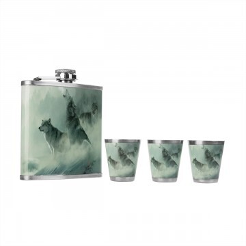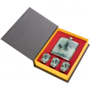 Подарочный набор "Книга охотника Волки" – это набор 4 в 1 в красочной коробке, открывающейся сверху, как книга: • 1 фляжка 210 мл; • 3 стопки. Фляжка и стопки изготовлены из нержавеющей стали. Сверху на них нанесена красочная картинка. Обложка картонной упаковки в виде книги фиксируется расположенными в ней магнитами.
