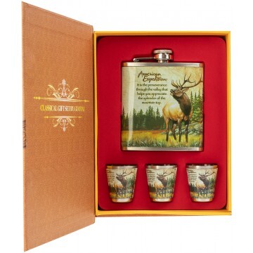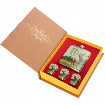 Подарочный набор "Книга охотника" - это набор 4 в 1 в красочной коробке, открывающейся сверху, как книга: • 1 фляжка 210 мл; • 3 стопки. Фляжка и стопки изготовлены из нержавеющей стали. Сверху на них нанесена красочная картинка. Обложка картонной упаковки в виде книги фиксируется расположенными в ней магнитами.