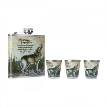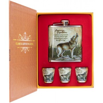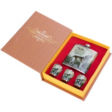 Подарочный набор "Книга охотника" - это набор 4 в 1 в красочной коробке, открывающейся сверху, как книга. Фляжка и стопки изготовлены из нержавеющей стали. Сверху на них нанесена красочная картинка. Обложка картонной упаковки в виде книги фиксируется расположенными в ней магнитами. Состав набора: • 1 фляжка, 210 мл; • Объем стопок - 50 мл. • 3 стопки.