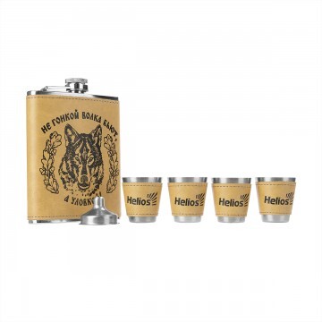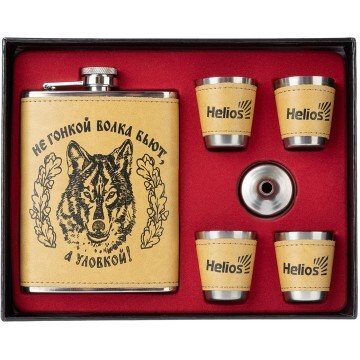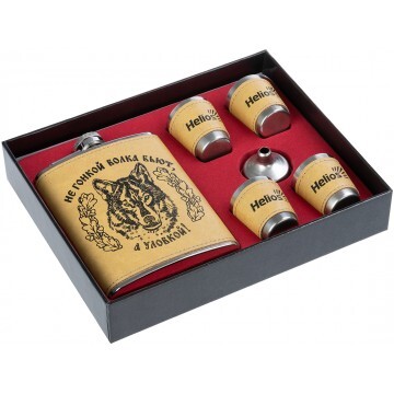 Подарочный набор в коробке: • 1 фляжка 240 мл; • Объем стопок - 50 мл. • 4 стопки; • Воронка. Фляжка и стопки изготовлены из нержавеющей стали и покрыты искусственной кожей.