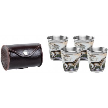 Набор из 4 стопок в кожаном чехле, с красочным рисунком. Характеристики: • Материал стопок – нержавеющая сталь. • Объем - 50мл.