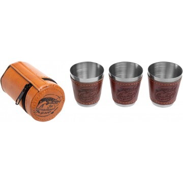 Набор из 3 стопок в кожаном чехле. Стопки декорированны полосой из искусственной кожи, с рисунком. Характеристики: • Материал стопок – нержавеющая сталь. • Объем - 30 мл.
