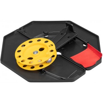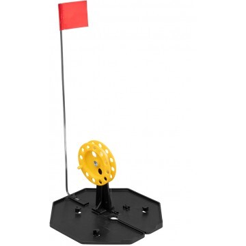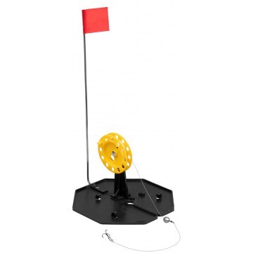 Жерлица зимняя для подледной ловли рыбы состоит из основания, стойки с катушкой и флажка-сигнализатора. Большое и прочное основание жерлицы из морозостойкого полипропилена гарантирует затемнение и защиту лунки от замерзания. Основание выполнено в виде восьмиугольника, что предотвращает проворачивание жерлицы в снегу. На основании находятся: прорезь для завода лески, паз под крепление стойки с катушкой, паз под крепление сигнализатора — флага.
