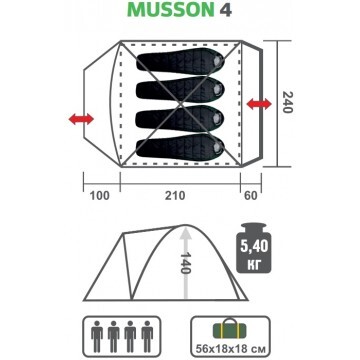 Палатка MUSSON 4 Helios - удобная 4-местная палатка с вместительным тамбуром, сформированным отдельной дугой. Особенности: • В тамбуре поместится большое количество снаряжения. • Тент палатки имеет 2-слойную структуру и оснащен 2 широкими входами. • Вентиляционные клапаны с 2 сторон обеспечат комфортный микроклимат в палатке. • Антимоскитная сетка. • Все швы проклеены. • Ремкомплект состоит из 6 заплат (внешний тент 2 цвета, внутренняя палатка 2 цвета, москитная сетка, дно палатки) размер 10 х 10 см. Характеристики: • Габаритные размеры палатки в рабочем состоянии: 370 х 240 х 140 см. • Внешний тент: Polyester 190T PU 3000 мм. • Внутренняя палатка: 100% дышащий Polyester. • Материал дна: Terpauling 120 , PU - 10000 мм. • Каркас: Fiberglass 7,9 мм. • Вес палатки: 5,4 кг • Размер в упакованном виде: 56 х 18 х 18 см.
