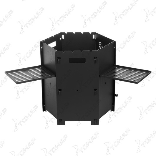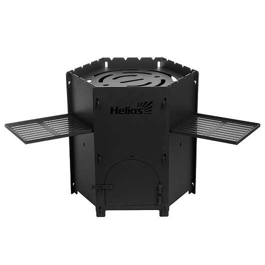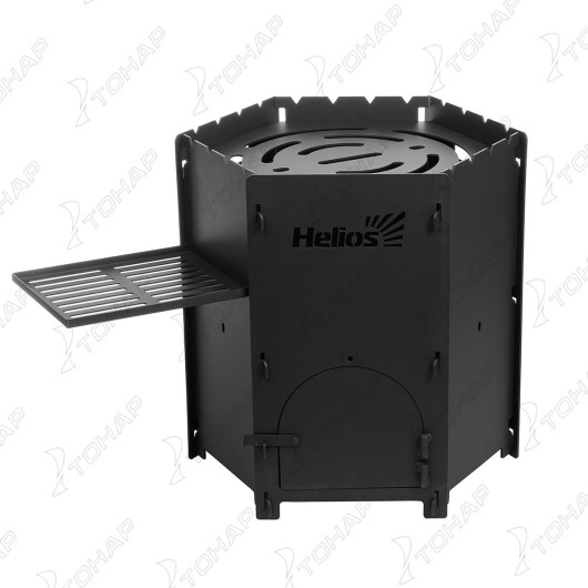 Многофункциональная печь под казан ПКM-02 торговой марки Helios применяется для приготовления пищи на природе, даче, на рыбалке и охоте. Конструкция печи - сборно-разборная. Для удобства готовки печь оснащена 2 боковыми столиками, которые позволяют держать необходимые предметы для готовки под рукой. Детали корпуса печи выполнены из стали толщиной 3 мм и вырезаны на лазерном станке, поэтому все края деталей ровные и гладкие. Дверка из прочной стали не позволяет жару покинуть печную топку, что обезопасит вас от ожогов и позволит комфортно стоять у печи во время приготовления пищи. Верхняя крышка с прорезями позволяет устанавливать на печь обычную посуду: чайники, кастрюли, сковороды и готовить на печи, как на плите. Для размещения казана на печи можно использовать круговую вставку из стальной полосы, которая идет в комплекте с печью. После использования печь легко разбирается и занимает минимум места в багажнике автомобиля. Для удобной транспортировки и хранения печь комплектуется чехлом из износостойкой ткани ОКсфорд 600Д. Варианты использования печи: - как печь для приготовления пищи в казане (* казан малого размера (4-8 л) устанавливается на дополнительную вставку с круглым отверстием (диаметр 30 см). - как мангал для приготовления шашлыков (в боковых стенках имеются прорези под шампура); - как печь для приготовления пищи на плите (верхняя крышка); - как уличный очаг. Характеристики: Материал: сталь Ст3, толщиной 3 мм; Покрытие: термостойкая краска. Габаритные размеры: ширина без столиков: 440 мм; ширина со столиками: 828 мм; высота: 450 мм; глубина: 393 мм; Вес: 20,5 (± 0,5) кг. Комплектация: Панель передняя - 1 шт. Панель навесная - 3 шт. Панель опорная - 2 шт. Съемная панель в сборе с дверкой - 1 шт. Дно - 1 шт. Съемная панель под казан - 1 шт. Столики - 2 шт. Винт М5х32 - 1 шт. Гайка М5 - 1 шт. Руководство по эксплуатации - 1 шт. Сумка - 1 шт. Внимание! Перед первым использованием изделие необходимо обжечь в течение 30-40 минут, не загружая продукты. Термостойкая краска набирает большую прочность после первого обжига. При обжиге возможно дымление и испарение растворителя, оставшегося в краске. Возможно образование пузырьков и трещинок на поверхности покрытия, что не является гарантийным случаем. Во время обжига во избежание повреждения покрытия запрещается пользоваться инструментами (кочергой, совком и т.д.) и прикасаться ими к поверхностям печи. После обжига изделие должно остыть, после чего защитное покрытие окончательно упрочняется.