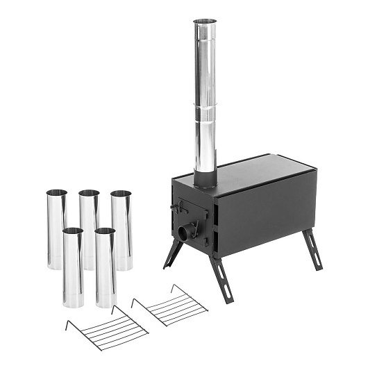 Печь универсальная ПУ-500М Helios - это портативная печь, предназначенная для обогрева передвижных сборно-разборных конструкций, палаток, малогабаритных помещений (гаражей), а также мобильных бань. Может использоваться для подогрева или приготовления пищи. Конструкция печи включает в себя: корпус (топочную камеру) на складных ножках, искрогаситель, дверцу с регулятором подачи кислорода, отражающие защитные экраны с 4 сторон (три боковых и один под дном), 2 решетки для сушки, дымоход. Материал корпуса печи: высококачественная жаропрочная сталь Ст3 толщиной 1 мм (с термостойким покрытием). Швы тщательно проварены для лучшей герметичности и увеличения срока службы. В верхней части топочной камеры расположена специальная пластина - искрогаситель, что увеличивает КПД печки при использовании в палатке в зимнее время года. Искрогаситель образует дополнительную камеру сгорания, которая не позволяет теплу покидать топочную камеру напрямую. В качестве топлива рекомендуем использовать дрова (желательно лиственных пород), брикеты или пеллеты. Печь оборудована регулятором подачи воздуха, с помощью которого можно регулировать количество воздуха необходимого для горения. Сборный дымоход состоит из 7 модулей (диаметр трубы 80 мм, длина 1 модуля - 300 мм). Отражающие экраны играют важную роль в безопасности применения печи длительного горения. Печь оборудованная нижним и 3 боковыми отражающими экранами, которые обеспечивают максимальный уровень пожарной безопасности, защищая дно и тент палатки, грунт и личные вещи от оплавления и возгорания. Отражающие экраны также обеспечивают конвекционные потоки вдоль корпуса, способствуя быстрому нагреву воздуха. Складные ножки обладают отличной устойчивостью, быстро устанавливаются, а также значительно уменьшают транспортировочные размеры печки. Верхнюю поверхность печи можно использовать для приготовления или разогрева пищи, разместив на ней металлическую посуду (например, кастрюлю или чайник). В комплекте с печью идет чехол (вещмешок) из износостойкой ткани Оксфорд 600Д для хранения и транспортировки. Материал корпуса: Сталь Ст3, толщина 1 мм (с термостойким покрытием). Объем топки: 26,5 л. Габаритные размеры топки: 230х230х500 мм. Длина изделия: 561 мм. Ширина (с решетками/без решеток): 651/398 мм. Высота (с патрубком): 446 мм. Макс. длина дров: 480 мм. Диаметр модуля дымохода: 80 мм. Длина 1 модуля дымохода: 300 мм. Макс. высота печи с трубой: 2,2 м. Вес изделия: 12,5 (± 0,1) кг. Размер упаковки (коробка): 635х290х335 мм. Комплектация: Корпус с защитными экранами – 1 шт. Модули трубы дымохода – 7 шт. Решетка – 2 шт. Чехол транспортировочный - 1 шт. Руководство по эксплуатации - 1 шт. * Рекмендуем использовать датчик СО для измерения концентрации угарного газа в палатке/помещении (в комплект не входит). ** Во время эксплуатации возможны незначительные деформации металла, которые не ухудшают технических характеристик печи. *** Перед первым использованием печи необходимо закрепить термостойкое покрытие - обжечь дровами не менее 1 часа. Термостойкая краска набирает большую прочность после первого обжига. При обжиге возможно появление дыма и испарение растворителя, оставшегося в кремнийорганической эмали. Рекомендуется во время первых растопок печи обеспечивать хорошую вентиляцию в помещении. Горение необходимо продолжить до исчезновения неприя
