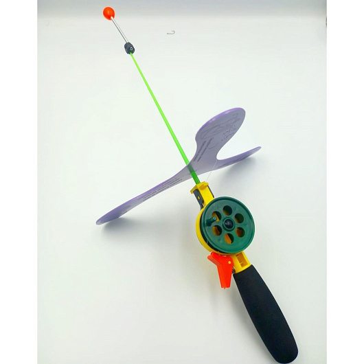 Удочка зимняя оснащенная с катушкой. Предназначенна для отвесной ловли форели на пасту. На катушке намотано не менее 10 метров монофильной лески диаметром 0,26 мм. Крючек №6. Гркуз 'оливка' - 5 гр. Кивок. В комплекте идет подставка 'бумеранг'