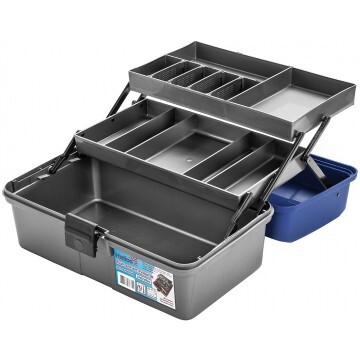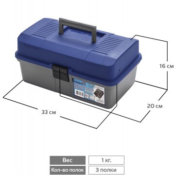 Прочный и надежный ящик для инструментов и разных бытовых мелочей позволит компактно их хранить и переносить. Две выдвижные полки с различными отсеками обеспечивают возможность хранения множества мелочей: болты, шайбы, шурупы, сверла и т.д. Материал ящика: ударопрочный и морозостойкий пластик. Преимущество пластика в том, что ящик имеет небольшой вес (1 кг). Морозоустойчивый пластик позволит защитить находящийся внутри инструмент от значительных перепадов температур. Характеристики: Длинна, см.: 33 Ширина, см.: 20 Высота,см: 16 Вес, кг.: 1 Цвет: синий.