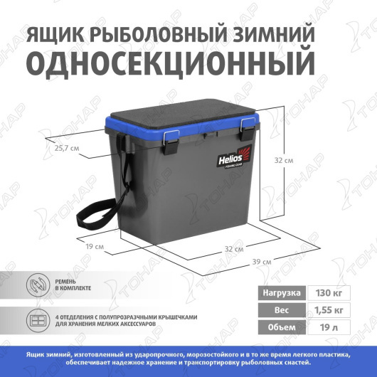 Ящик рыболовный зимний односекционный торговой марки Helios, изготовленный из ударопрочного, морозостойкого и в то же время легкого пластика, обеспечивает надежное хранение и транспортировку рыболовных снастей. Благодаря объему 19 литров, ящик вместит очень много полезных снастей для рыбалки. Основной отсек предназначен для переноски рыболовных снастей, термоса, так же удобен для перевозки улова. На внутренней стороне крышки размещены 4 отеделения с полупрозразчными крышечками для хранения мелких аксессуаров. Надежные и прочные замки не позволят изделию самопроизвольно открыться, а удобный наплечный ремень поможет комфортно его транспортировать. Пластиковый каркас выдерживает низкие температуры до -40˚С, не пропускает и не впитывает воду. Мягкое незамерзающее сиденье на крышке ящика, аккумулирующее тепло, позволит рыболову комфортно рыбачить с ящика долгое время. На дне ящика расположены специальные насечки против скольжения по льду. Летом подобный ящик несомненно пригодится для береговой рыбалки, когда необходимо иметь все снасти под рукой. Характеристики: Материал: ударопрочный и морозостойкий пластик, не впитывающий и не пропускающий воду. Нагрузка: 130 кг. По проведенным тестированиям максимальная нагрузка ящика - 210 кг. Объем: 19 л. Длина: 39 см (по верху), 32 см - по низу. Ширина: 25,7 см (по верху), 19 см - по низу Высота: 32 см Вес: 1,55 кг. Цвет: серый/синий. Ящик рыболовный зимний односекционный серый/синий